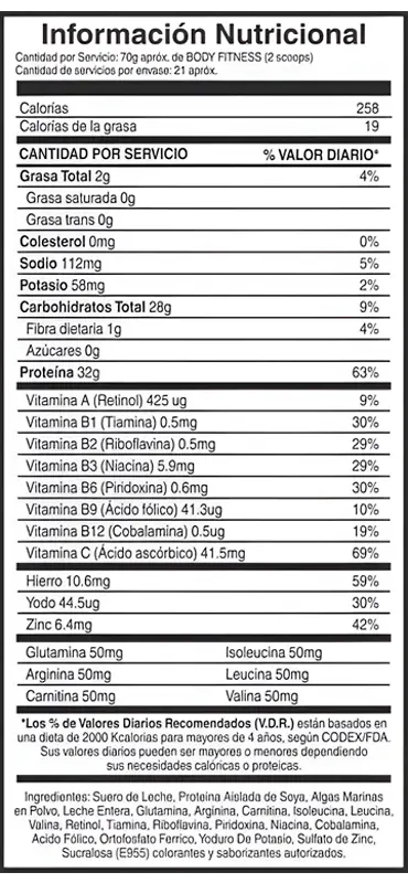 BODY FITNESS tiene un alto porcentaje de Proteínas. BODY FITNESS dentro de su formulación contiene Suero de Leche y Proteína Aislada de Soya; además esta enriquecido con L-Glutamina, L-Arginina y L-Carnitina.
