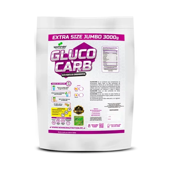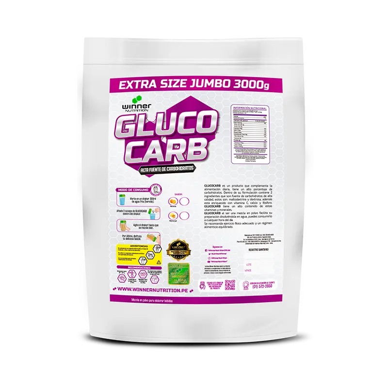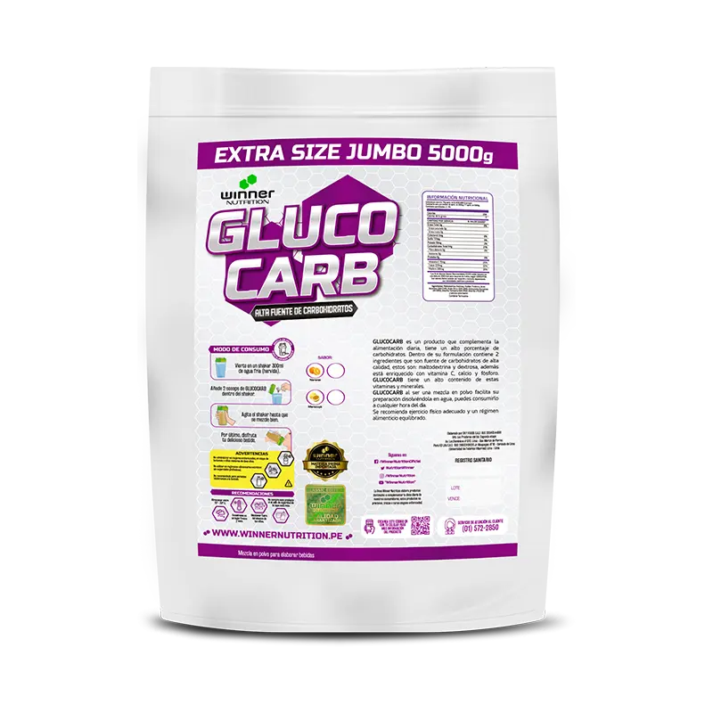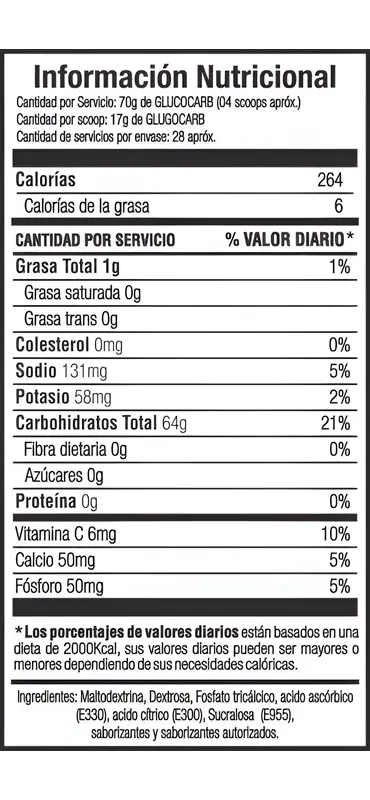 GLUCOCARB es un producto que tiene un alto porcentaje de Carbohidratos. Dentro de su formulación contiene 2 ingredientes que son fuente de carbohidratos de alta calidad, estos son; Maltodextrina y Dextrosa, además como si fuera poco esta enriquecido con vitamina C, Calcio y Fosforo