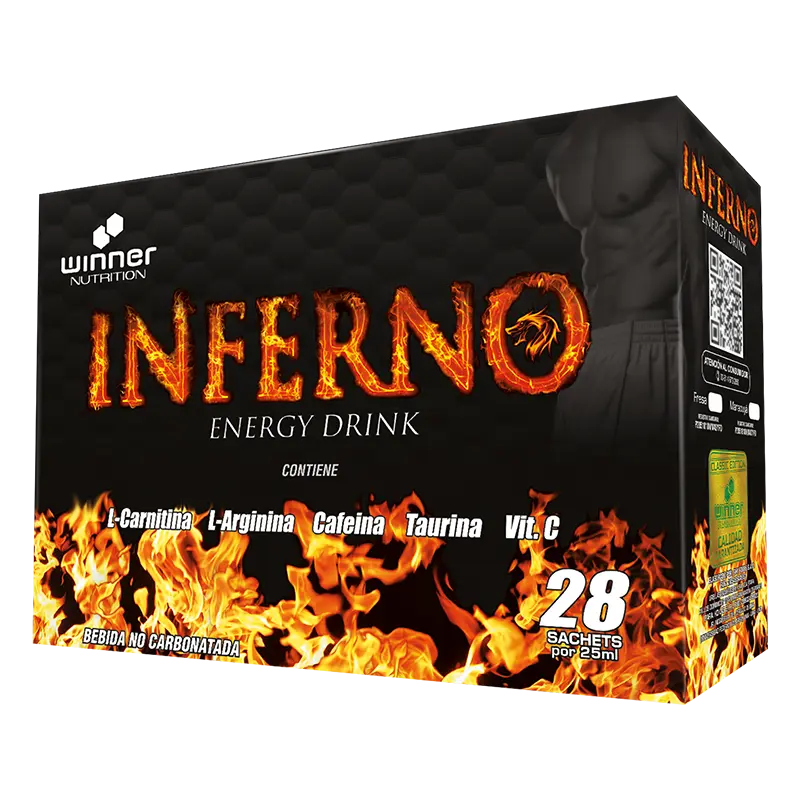 Inferno es una bebida energizante, está elaborado a base de L-Carnitina, L-Arginina, Taurina, Cafeína y Vitamina C en definitiva contiene la formulación exacta de aminoácidos, para lograr buenos resultados y así poder lograr nuestros objetivos tan deseados, viene en sachet dosificado para que pueda ingerir las cantidades exactas del producto. Pueden consumir tanto personas aficionadas a algún deporte o atletas, y recuerda que llevar un buen régimen alimentario llevando una dieta variada, equilibrada, y ejercicio físico son recomendables ya sea para que puedas llevar una mejor salud o reducir el porcentaje de grasa adicional de modo gradual.