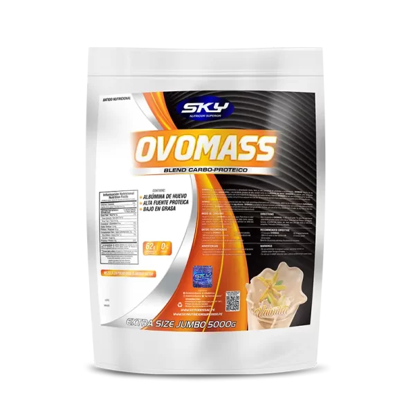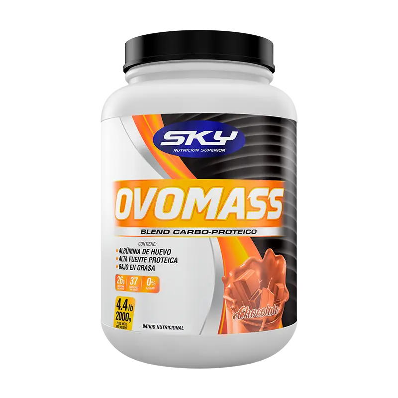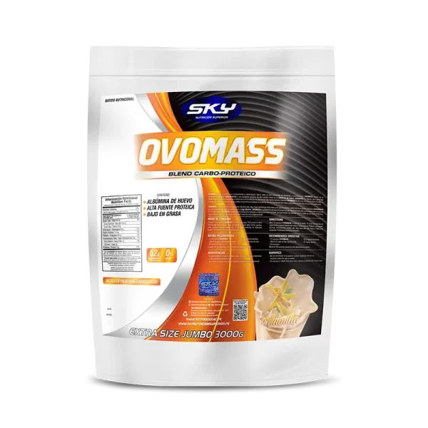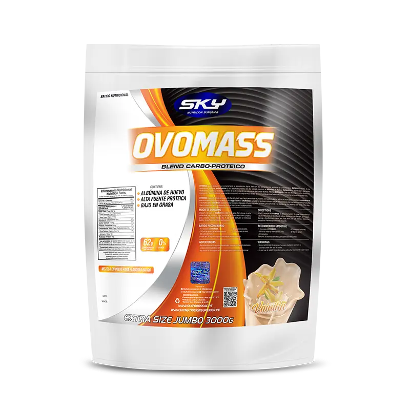 OVO MASS es un concentrado carbo-proteico instantáneo de albúmina de huevo deshidratado (solo claras) lo cual lo hace también ideal para persona que sean intolerantes a la lactosa y no puedan consumir ningún producto lácteo, además contiene un carbohidrato de calidad como es la maltodextrina el cual se caracteriza por su rápida asimilación en comparación con fuentes de carbohidratos comunes. Contiene una alta concentración proteica que junto a la maltodextrina trabajan para aportar un balance energético que permita al cuerpo recuperar de forma instantánea las energías consumidas tras el entrenamiento intenso. A su vez, también son recuperados los aminoácidos que servirán para apoyar al desarrollo muscular. OVOMASS tiene las virtudes de ser altamente digerible y reconstituyente, ideal para tomar en las bebidas post entrenamiento.