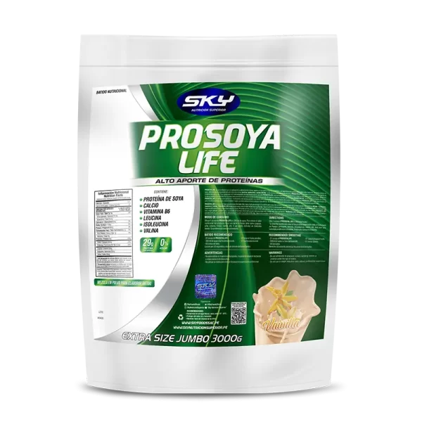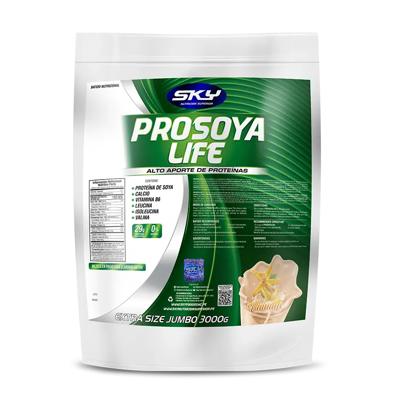 PROSOYA LIFE excelente alternativa nutricional gracias a los aportes y beneficios de la Proteína Aislada de Soya, Calcio y Aminoácidos BCAAs. La proteína de Soya es la que mayor aporte proteico ofrece dentro del reino vegetal, podemos encontrar cantidad de vitaminas y minerales, con nada de colesterol y escasas grasas saturadas. PROSOYA LIFE es un producto totalmente factible que ayudará al deportista en materia de complementar sus requerimientos proteicos diarios ideal para mantener su masa muscular sin incrementar el % de grasa, además también es ideal para personas que son intolerantes a la lactosa y deseen consumir una buena proteína. Los fitonutrientes o isoflavones contenidos en la proteína de soya, acompañado de un régimen alimentario equilibrado y ejercicio físico puede ayudar a prevenir enfermedades coronarias, reducir los niveles de colesterol en la sangre, prevenir la osteoporosis y en mujeres adultas también podría aliviar los síntomas de la menopausia.