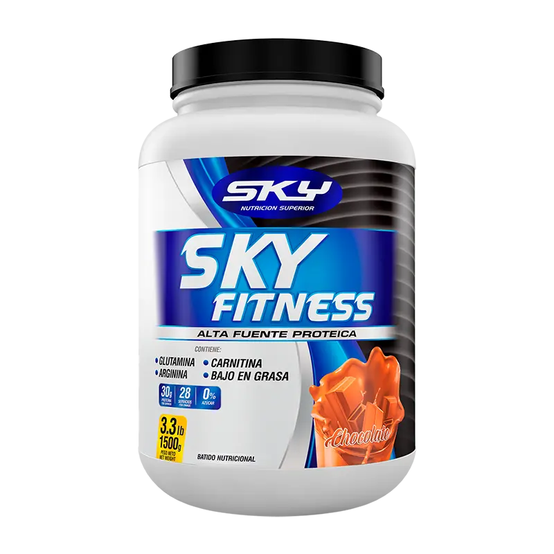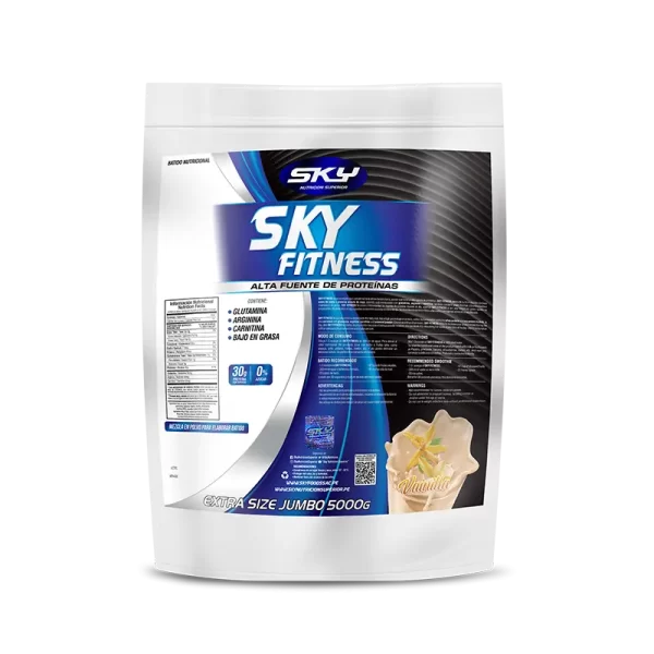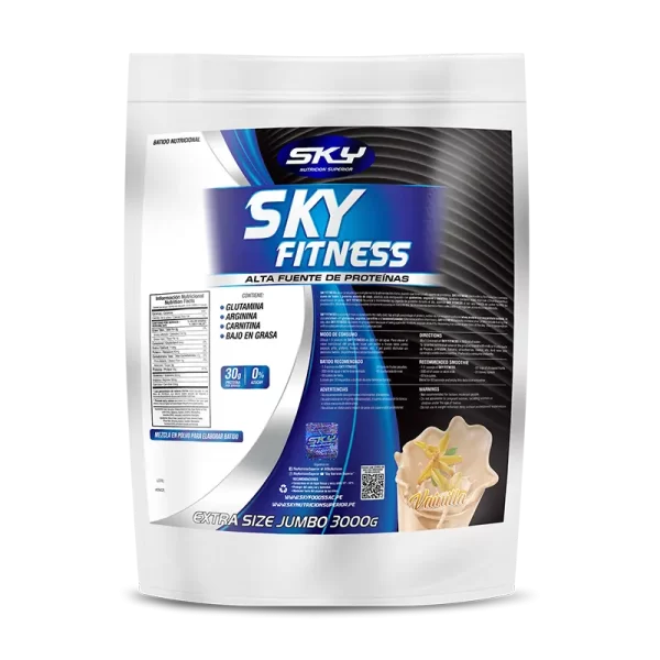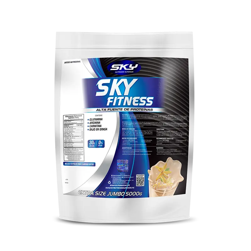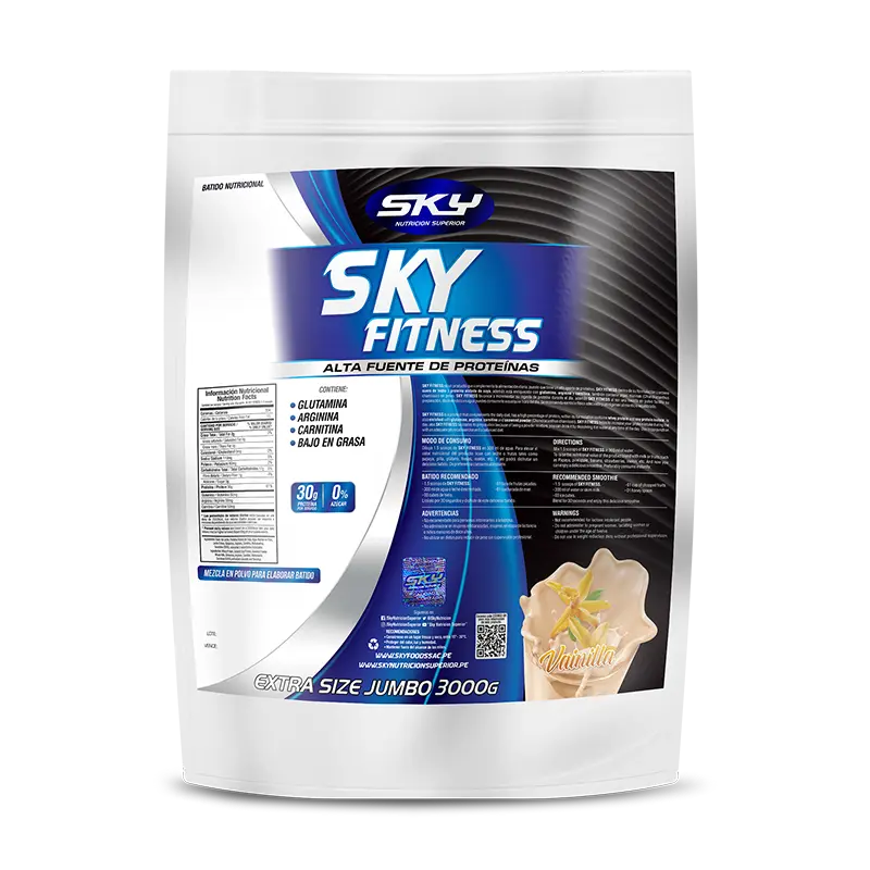 Mezcla en polvo para elaborar batido. SKY FITNESS es un producto que complementa la alimentación diaria, está elaborado a base de Suero de Leche, Proteina Aislada de Soya, Algas Marinas. Para complementar aún más a SKY FITNESS está enriquecido con L-Glutamina, L-Arginina y L-Carnitina, aporta un alto porcentaje de proteínas y un bajo índice de grasa.