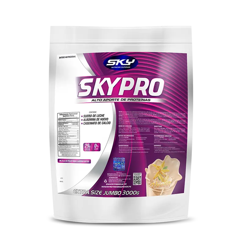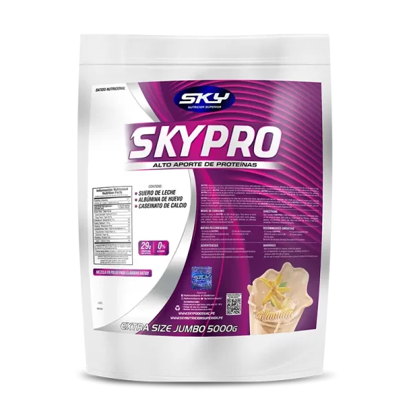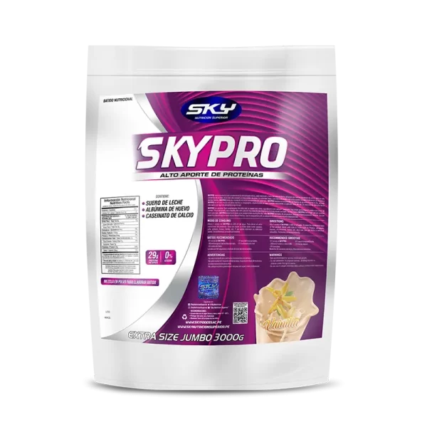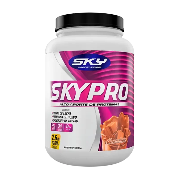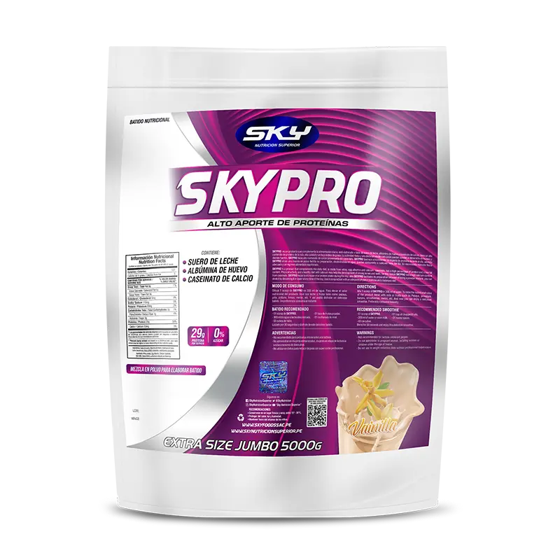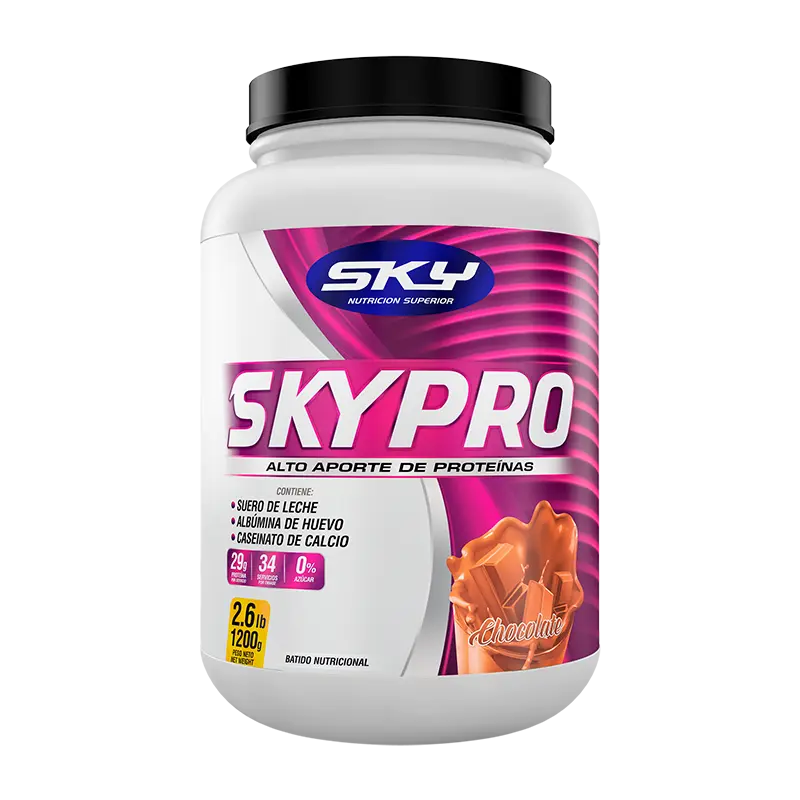 Toda persona incluyendo las que realizan actividad física necesita de nutrientes que ayuden a recuperar, promover y mantener músculos y todo tipo de tejidos conectivos en el menor tiempo posible, facilitándote un mejor desempeño deportivo. Hoy el nuevo SKYPRO (nueva fórmula con Caseinato), es un alimento proteico que contiene 3 fuentes de proteínas como el Suero de Leche, Albúmina de Huevo y el Caseinato de Calcio. El suero de Leche nos aportará rápidamente aminoácidos al torrente sanguíneo que posteriormente serán renovados con los aminoácidos de la Albúmina de Huevo; finalmente el Caseinato nos aportará aminoácidos de forma prolongada y lenta logrando de esta manera que el abastecimiento de aminoácidos durante los momentos críticos (catabolismo) esté completamente asegurado con todos los nutrientes que se necesitan para cubrir los requerimientos recuperativos y de mantenimiento muscular.