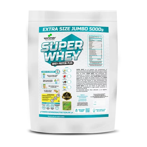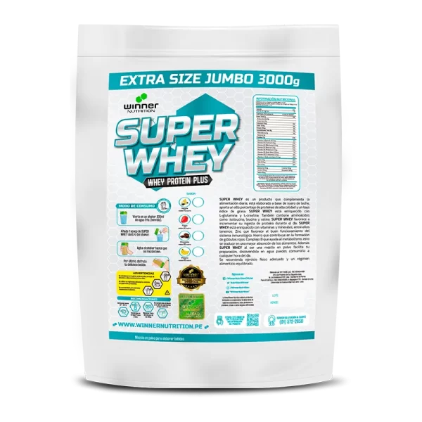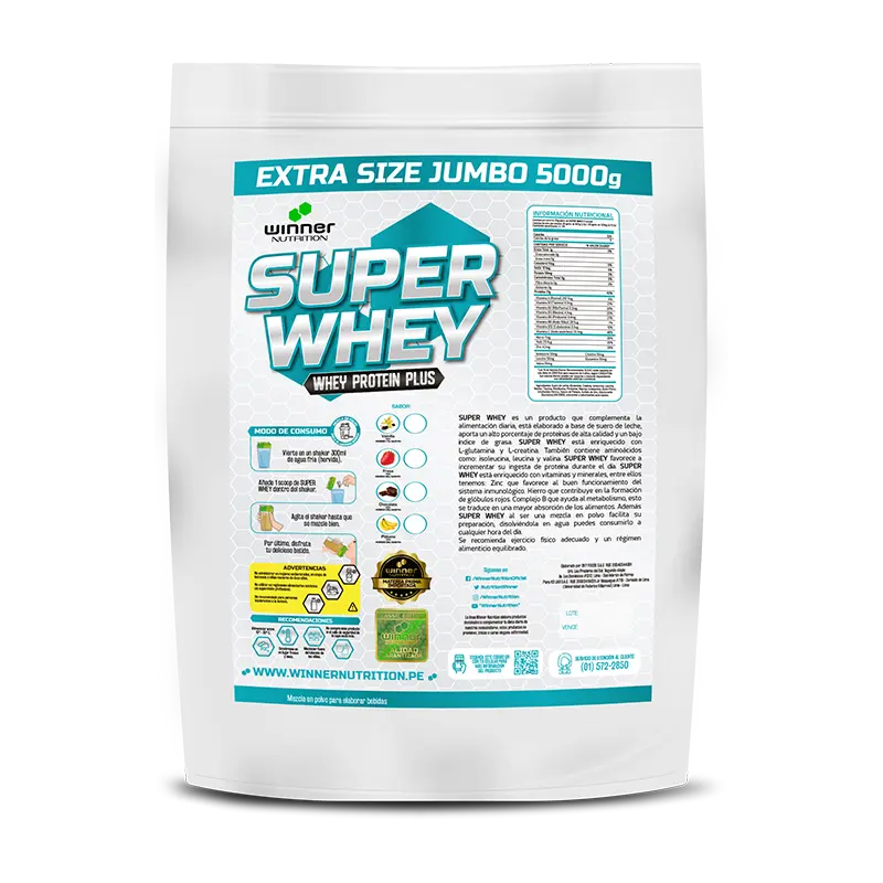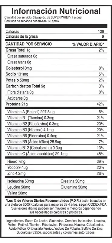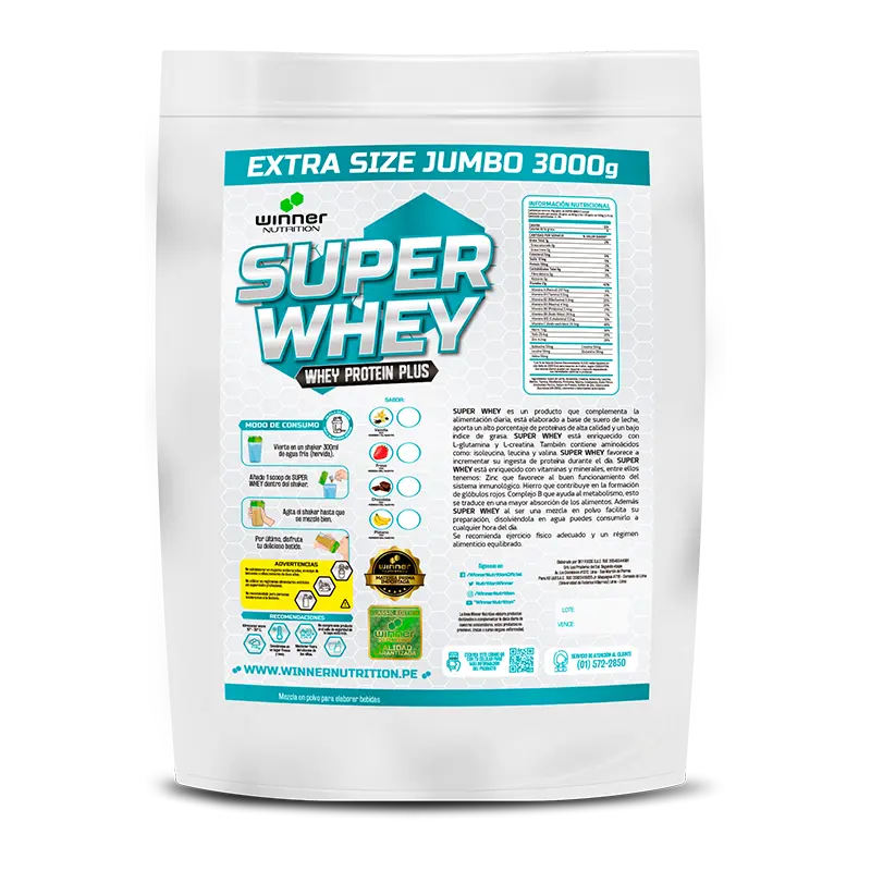 SUPER WHEY es un producto que complementa la alimentación diaria, está elaborado a base de Suero de Leche, aporta un alto porcentaje de proteínas de la más alta calidad y un bajo índice de grasa. SUPER WHEY está enriquecido con L-Glutamina y L-Creatina. También contiene aminoácidos como: Isoleucina, Leucina y Valina (BCAAs – Aminoácidos de Cadena Ramificada). SUPER WHEY favorece a incrementar su ingesta de proteína durante el día. Una buena nutrición está asociada con una buena salud. El correcto aporte diario de vitaminas es una parte importante en la ecuación de la nutrición, siendo esenciales para el óptimo cuidado de la salud, en este sentido, SUPER WHEY para complementar aún más este producto está enriquecido con vitaminas y minerales, entre ellos tenemos: Zinc que favorece al buen funcionamiento del sistema inmunológico. Hierro que contribuye en la formación de glóbulos rojos. Complejo B que ayuda al metabolismo, esto se traduce en una mayor absorción de los alimentos. Además SUPER WHEY al ser una mezcla en polvo facilita su preparación, disolviéndola en agua puedes consumirlo a cualquier hora del día.