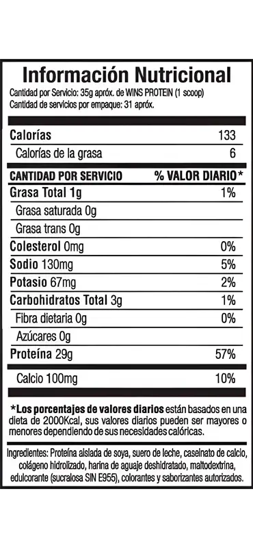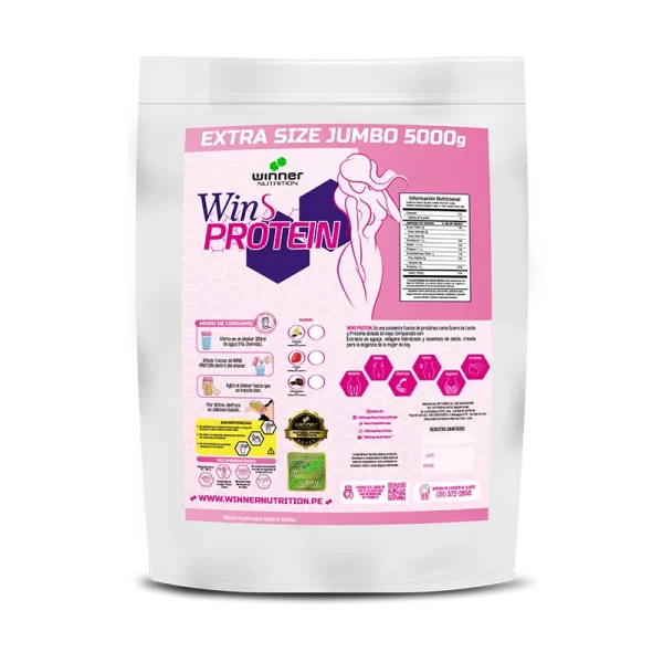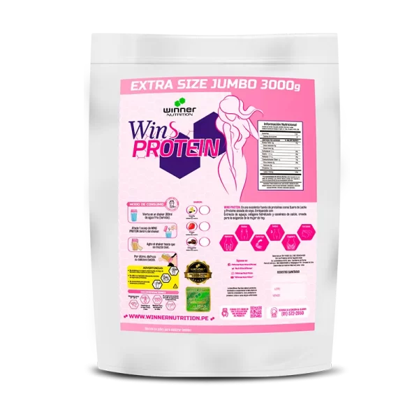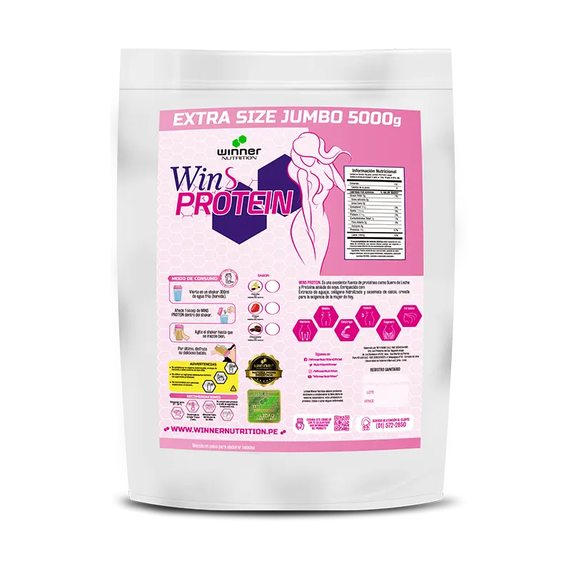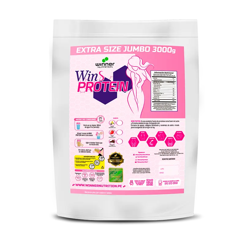 Wins Protein es una proteína creada solo para ellas, ayuda al desarrollo y tonificación muscular y así poder moldear la figura, esto es gracias al aporte de 3 fuentes de proteínas de calidad que contiene el producto; además como si fuera poco también contiene colágeno hidrolizado que nos ayuda a poder atenuar las arrugas y estrías, reforzar el crecimiento de las uñas, cabello y mantener una piel más tersa y lozana.Se recomienda ejercicio físico adecuado y un régimen alimenticio equilibrado.